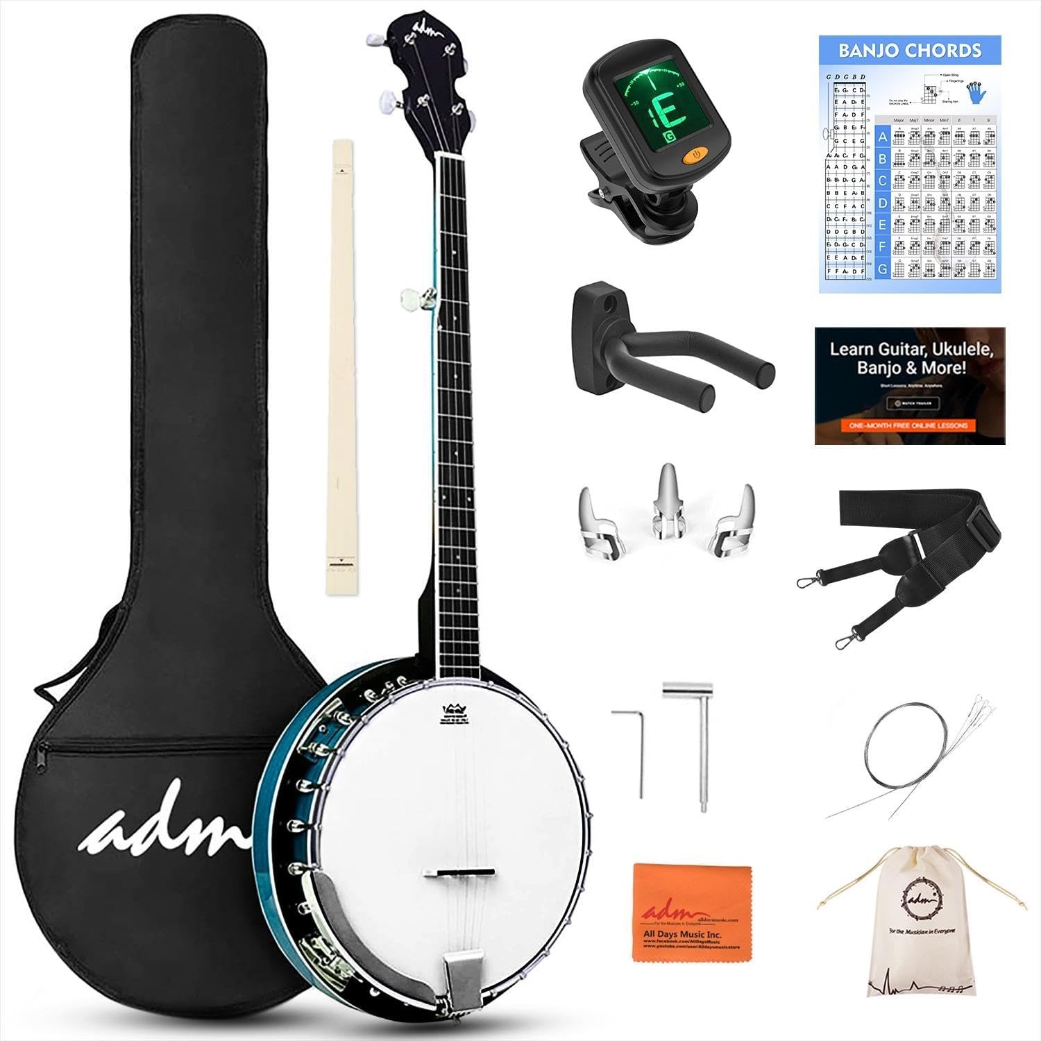 This ADM 38" (JB352-BGR) 5-string resonator banjo kit is a beginner-ready instrument that pairs a Remo-style drum head with quality tonewoods and a geared 5th tuner for stable tuning and clear tone.